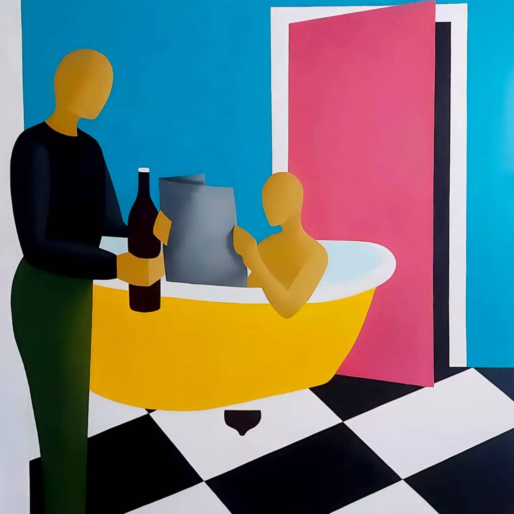 “Transformo escenas cotidianas en metáforas visuales a través de figuras anónimas y colores vibrantes, evocando lo íntimo y lo universal.”